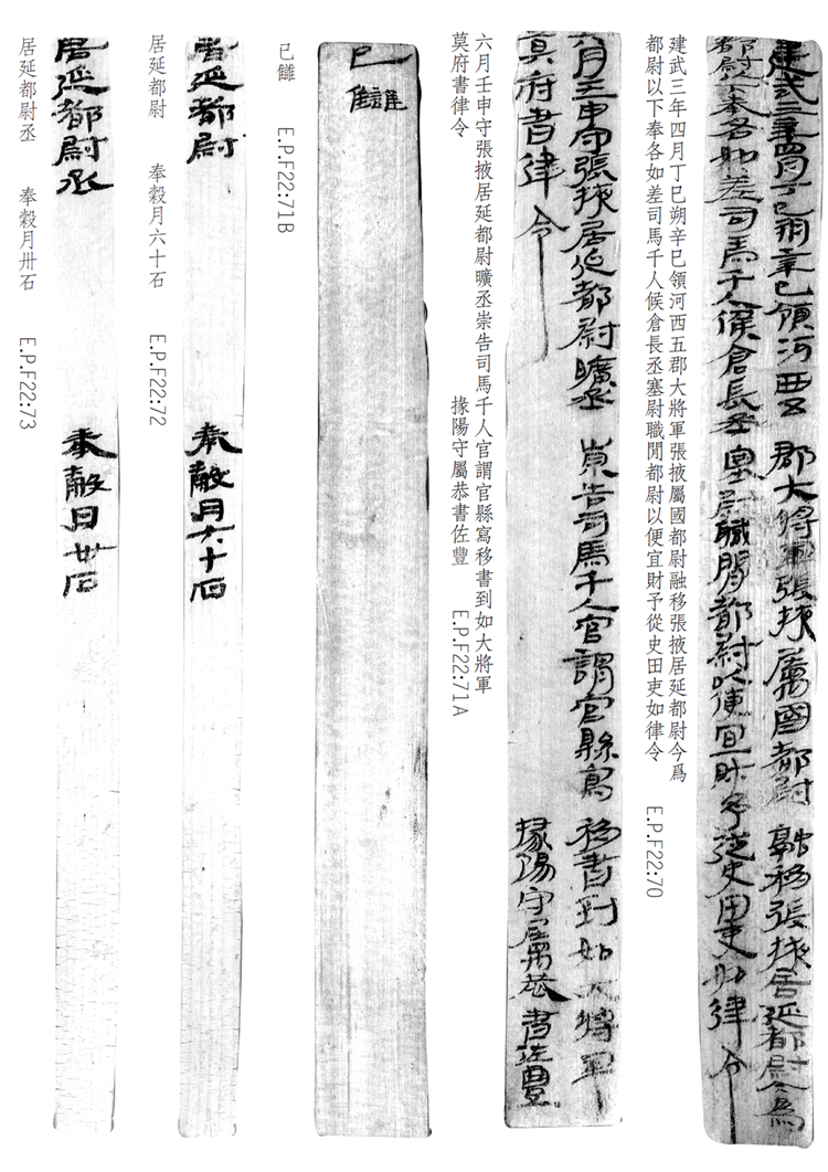 1974年8月出土于甲渠候官遺址第22號(hào)房址內(nèi)。簡(jiǎn)冊(cè)由10枚簡(jiǎn)組成,每簡(jiǎn)長(zhǎng)22.8厘米,前兩簡(jiǎn)寬2.5厘米,其余8簡(jiǎn)寬1.4厘米。全文200字。內(nèi)容為東漢建武三年(公元25年)竇融統(tǒng)治河西期間留下的一份完整的財(cái)政文書。簡(jiǎn)文是關(guān)于居延都尉府吏員奉谷標(biāo)準(zhǔn)的通知,由領(lǐng)河西五郡大將軍張掖屬國(guó)都尉竇融幕府下發(fā),簡(jiǎn)言“如律令”可知其指令具有法律效力。