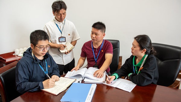 圖為唐玉軍(右二)正在與同事們一起研判問(wèn)題線索。張津 攝