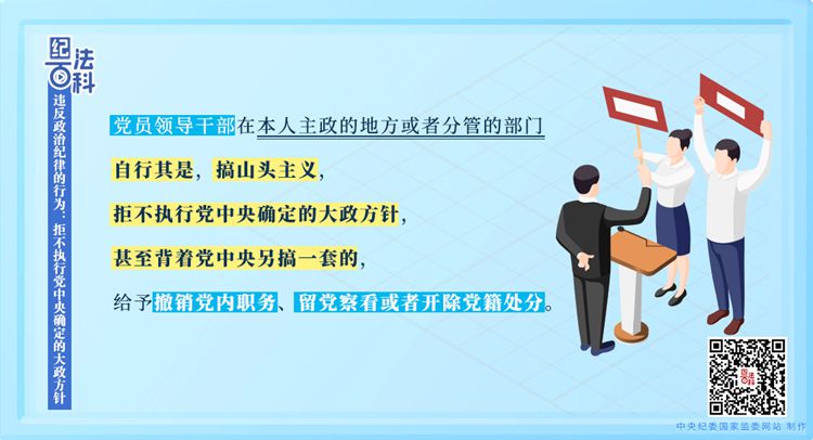 《中國共產(chǎn)黨紀律處分條例》第五十六條第一款規(guī)定,黨員領導干部在本人主政的地方或者分管的部門自行其是,搞山頭主義,拒不執(zhí)行黨中央確定的大政方針,甚至背著黨中央另搞一套的,給予撤銷黨內(nèi)職務、留黨察看或者開除黨籍處分。