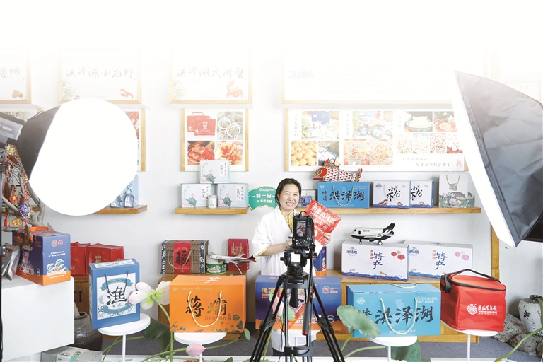 5月21日,江蘇省淮安市洪澤區(qū)“漁姑娘”助農(nóng)直播間內(nèi),主播正在向網(wǎng)友介紹當?shù)靥厣r(nóng)產(chǎn)品。陳凱 攝