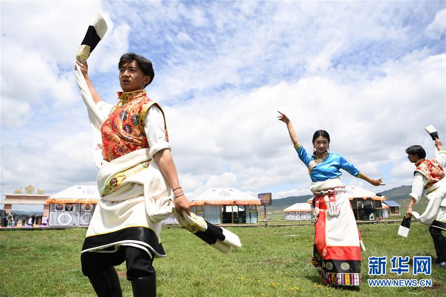 幾名藏族演員在甘南藏族自治州碌曲縣尕海鎮(zhèn)尕秀村帳篷城景區(qū)的草原上表演舞蹈(6月20日攝)。 新華社記者 陳斌 攝
