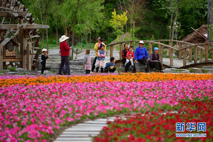 村民在甘南藏族自治州臨潭縣八角鎮(zhèn)牙扎村的花海景點(diǎn)休憩(5月28日攝)。 新華社記者 陳斌 攝