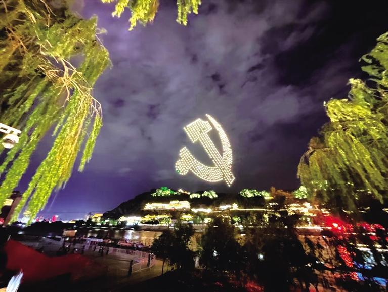 今夜的蘭州經(jīng)過(guò)雨水的沖洗格外清爽嫵媚,在現(xiàn)場(chǎng),600架無(wú)人機(jī)翱翔天空,照亮璀璨的蘭州之夜,無(wú)人機(jī)在遙控下變換著各種隊(duì)形和字樣,表達(dá)對(duì)黨的生日祝福。