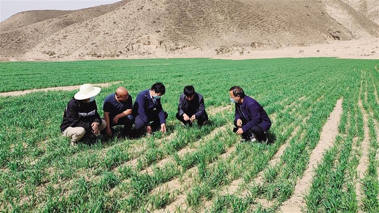 中國甘肅網(wǎng)5月11日訊 據(jù)蘭州日?qǐng)?bào)報(bào)道記者 程珊珊 文/圖)走進(jìn)皋蘭縣石洞鎮(zhèn)鎮(zhèn)東灣村的田間地頭,只見綠油油的麥田分布在村道兩旁,蘊(yùn)含綠色的期盼。皋蘭縣農(nóng)技中心主任王朝軍又下地了,帶著小鏟子、鋼卷尺等幾件從不離身的家伙。走進(jìn)麥田觀察根系、測量株高,細(xì)心查看苗情、墑情、肥情以及病蟲害情,而他的身邊還圍著不少村里的種糧大戶。