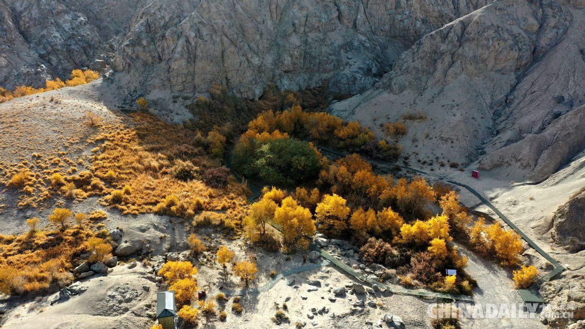 金秋十月,位于世界文化遺產(chǎn)敦煌市懸泉置遺址的懸泉谷內(nèi)的胡楊、蘆葦?shù)葮淠局脖槐磺锷秩荆吧绠嫞啦粍偈?。?jù)介紹,甘肅省敦煌市懸泉置遺址緊靠三危山山口。因水從高臺(tái)流下,懸空入潭,故名懸泉,敦煌當(dāng)?shù)厝怂追Q“吊吊水”,又稱貳師泉。