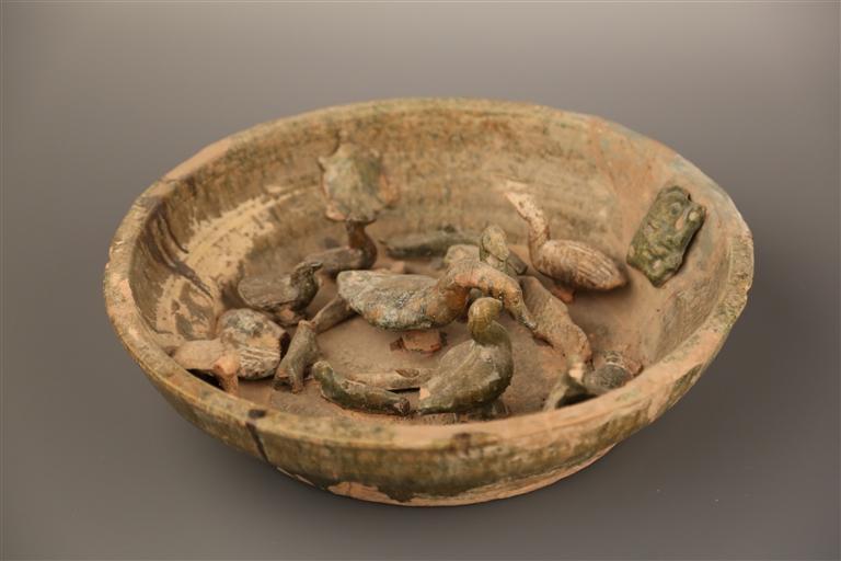 綠釉陶陂池高15厘米,口32厘米,底16厘米,為蘭州市博物館館藏三級文物。陶陂池內(nèi)有形象生動的鴨、鵝、龜、青蛙等造型,代表墓主人生前擁有這樣一份家產(chǎn)。陂池,指在自然坡地筑堤蓄水澆灌農(nóng)田的池塘、澤沼。我國興修陂池的歷史很早,傳說夏禹治水時,曾從事“陂九澤”的工程。利用地勢蓄水灌溉,在古代較為普遍,尤其在漢代時陂池工程得到較大發(fā)展。陂池養(yǎng)魚、家禽、種藕、種菱角、養(yǎng)龜,不僅可提高農(nóng)民的經(jīng)濟(jì)收入,豐富人們的食物來源,還可以起到美化環(huán)境、凈化水質(zhì)的作用,青蛙、田螺自由生存,起到平衡自然生態(tài)的作用。