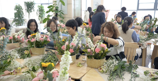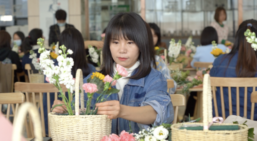 繁花似錦報春來,天姿國色抒情懷。活動現(xiàn)場花香四溢、芬芳溫馨,充滿著春天般的氣息,大家手捧鮮花,在花藝老師的講解下,開始學(xué)習(xí)各種鮮花所蘊含的花語祝福和選花、裁剪、搭配、造型及養(yǎng)護等藝術(shù)插花技巧。隨后,女工們將原本普普通通的月季、康乃馨、蝴蝶蘭、滿天星、向日葵等多種花材修剪整枝,根據(jù)不同的色彩和形狀有層次地搭配在一起。通過精心構(gòu)思造型、發(fā)揮創(chuàng)意想象,有的注重意境創(chuàng)設(shè)追求,有的突出枝情花韻之趣,有的抒展自然樸實風格……在細致地修飾和精心地創(chuàng)作下,一枝花、一棵草都變得詩情畫意和清新怡人,節(jié)日的喜慶氣氛瞬間升騰。