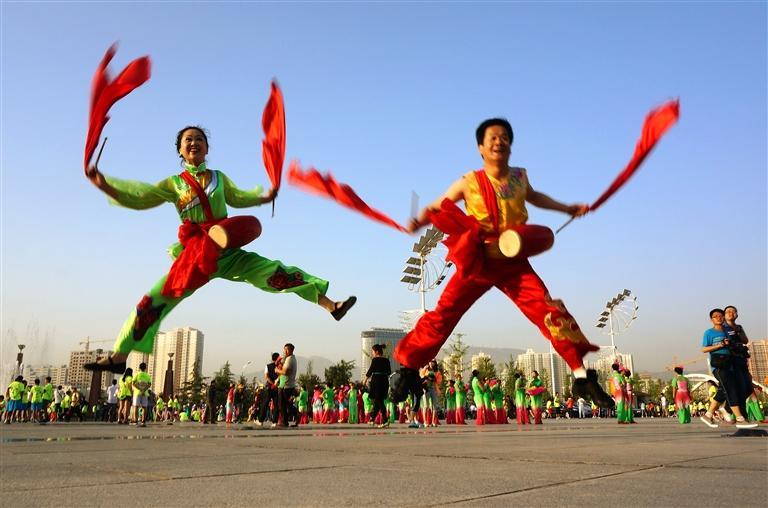 第一表演區(qū):奧體中心主會場廣場,表演內容:太平鼓、扇子舞、健身秧歌“黃河蘭州”、啦啦操;