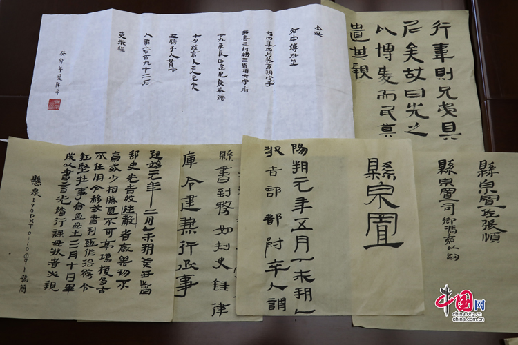 7月31日,蘭州大學(xué)古文字學(xué)強基計劃同學(xué)展示臨摹簡牘的書法作品。中國網(wǎng)記者 鄭偉 攝