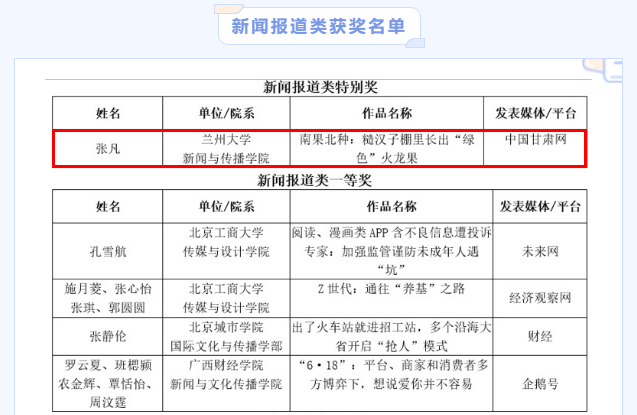 蘭州大學(xué)新聞與傳播學(xué)院獲獎(jiǎng)中,張凡的作品《南果北種!糙漢子棚里種出“綠色”火龍果》在中國甘肅網(wǎng)刊發(fā),系蘭州大學(xué)新聞與傳播學(xué)院、中國甘肅網(wǎng)聯(lián)合舉辦的第十三屆“重走中國西北角”接力采訪活動(dòng)新聞作品。