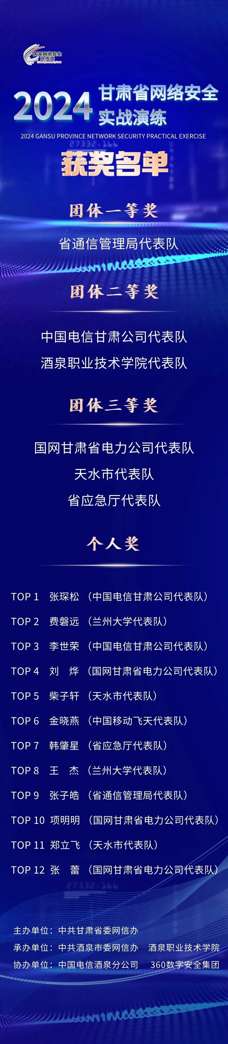 6月14日,2024年甘肅省網(wǎng)絡(luò)安全實戰(zhàn)演練在酒泉圓滿落下帷幕。來自全省各地、關(guān)鍵信息基礎(chǔ)設(shè)施保護(hù)部門、關(guān)鍵信息基礎(chǔ)設(shè)施運(yùn)營單位、省內(nèi)高校、國有企業(yè)、銀行、部隊等領(lǐng)域的60支代表隊180名參演選手經(jīng)過激烈角逐,最終產(chǎn)生團(tuán)體賽一等獎1個、二等獎2個、三等獎3個,個人獎12個。