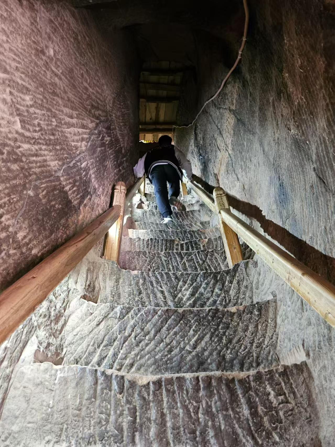 由第一層的北邊入內(nèi),隧道呈“之”字形,回廊曲折。里邊只能容納一個(gè)人行走,兩個(gè)人并坐,一共上去有129個(gè)臺階。石窟中的石砌臺階百轉(zhuǎn)千回,高低不一,不少階梯需要手腳并用才能上去,其艱難程度激發(fā)了游客的攀登欲,也有了“不到長城非好漢,不登三十三天真遺憾”的說法。