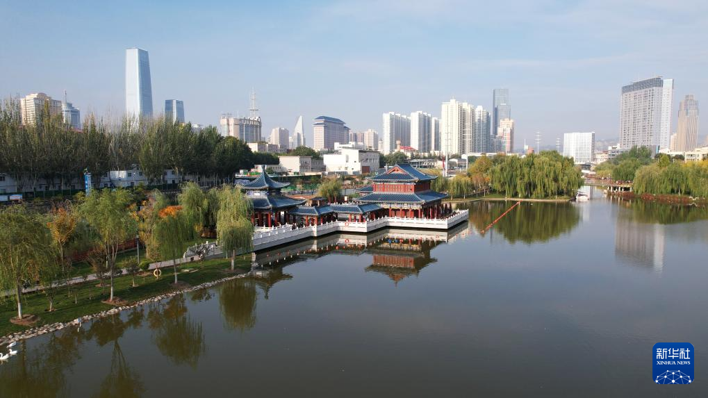 這是位于蘭州市城關(guān)區(qū)黃河岸邊的雁灘公園(10月17日攝,無(wú)人機(jī)照片)。新華社記者陳斌攝