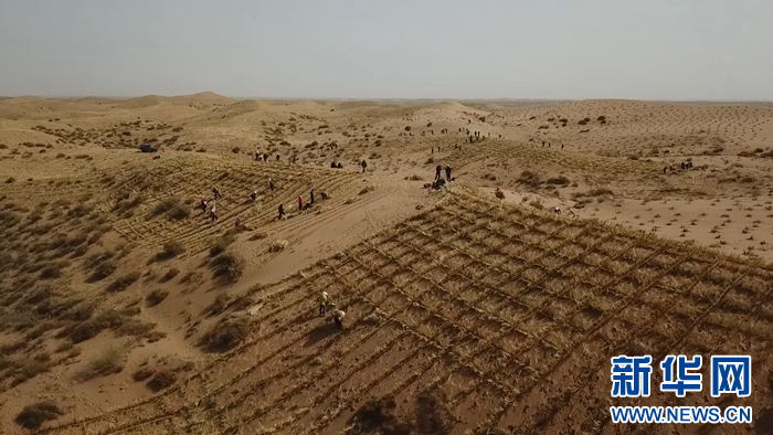 圖為甘肅省武威市古浪縣八步沙林場在扎草方格壓沙(資料圖片)。新華網(wǎng)發(fā)(童張偉 攝)