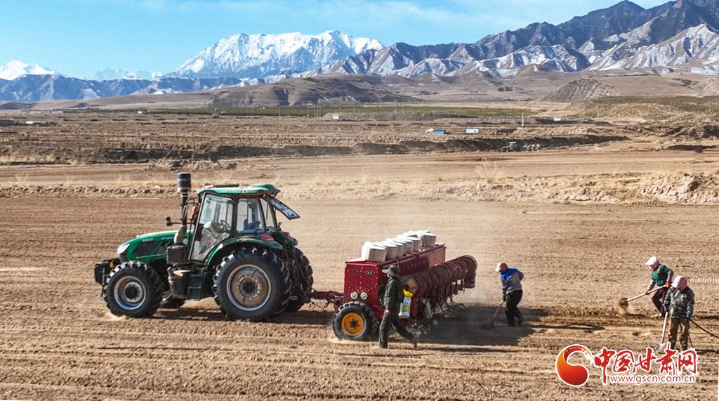4月1日,位于祁連山下的張掖市甘州區(qū)花寨鄉(xiāng)金花寨種植專業(yè)合作社小麥種植基地里,農(nóng)戶利用北斗導(dǎo)航自動(dòng)駕駛拖拉機(jī),牽引集播種、施肥、覆膜、滴灌帶鋪設(shè)于一體的播種機(jī)械,開展淺埋滴灌小麥播種。