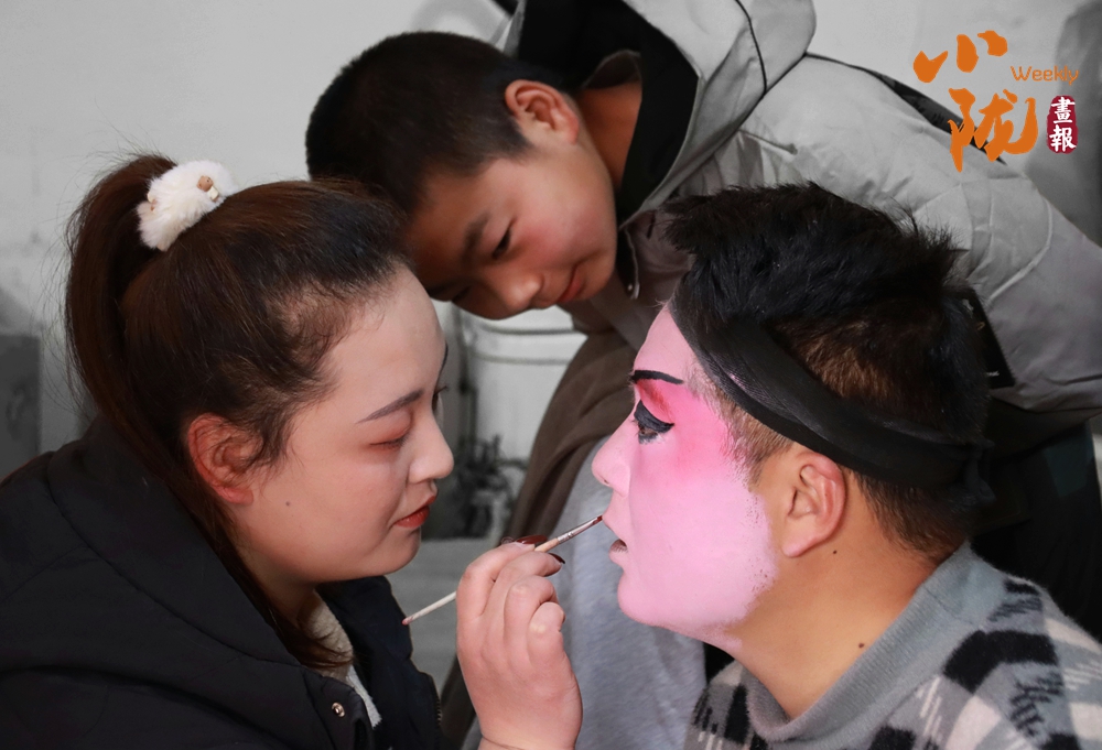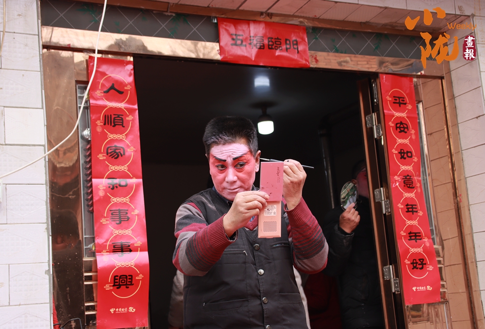 貼著紅春聯(lián)的屋門口,一位畫著戲曲臉譜的演員正對(duì)著手機(jī)調(diào)整妝容。這充滿鄉(xiāng)土氣息的戲曲準(zhǔn)備場(chǎng)景,滿是民間年俗里熱鬧又質(zhì)樸的煙火氣,也藏著傳統(tǒng)藝術(shù)在鄉(xiāng)土間的鮮活傳承。