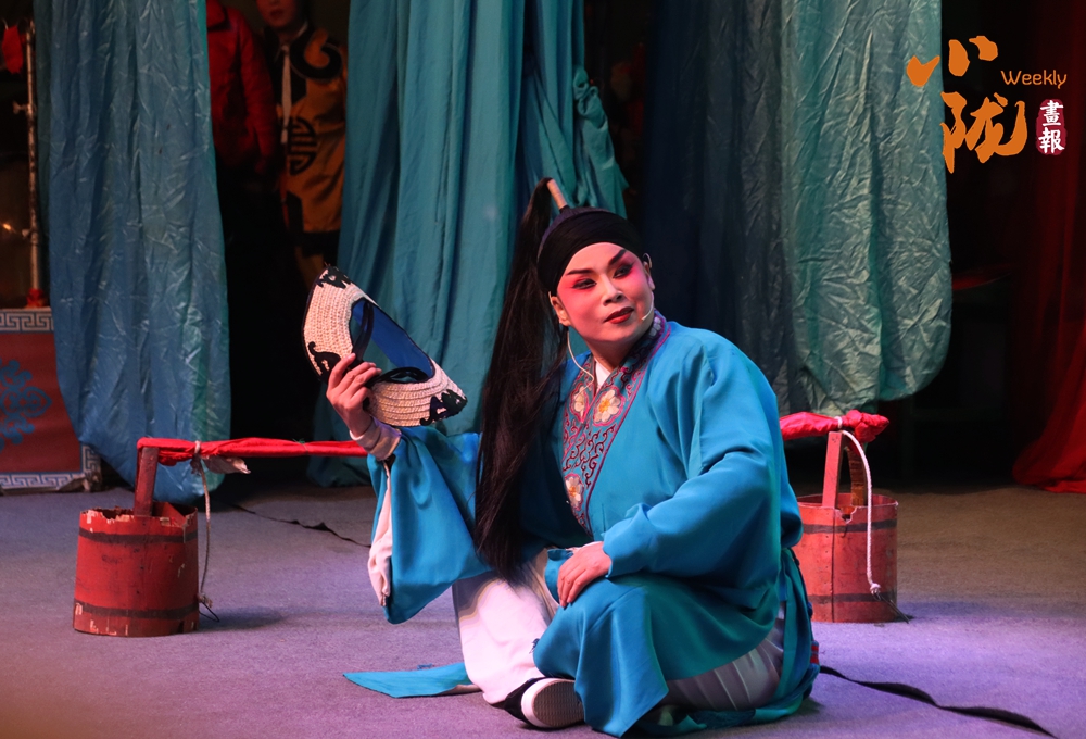舞臺(tái)的藍(lán)幕前,一位演員正以跪坐的姿態(tài)投入表演,身著繡著精致紋樣的青藍(lán)色戲服,手持折扇,眉眼間滿是戲韻。臺(tái)側(cè)的紅色水桶、幕后的隱約人影,讓這充滿程式化的舞臺(tái)瞬間多了幾分鄉(xiāng)土演出的真實(shí)感。