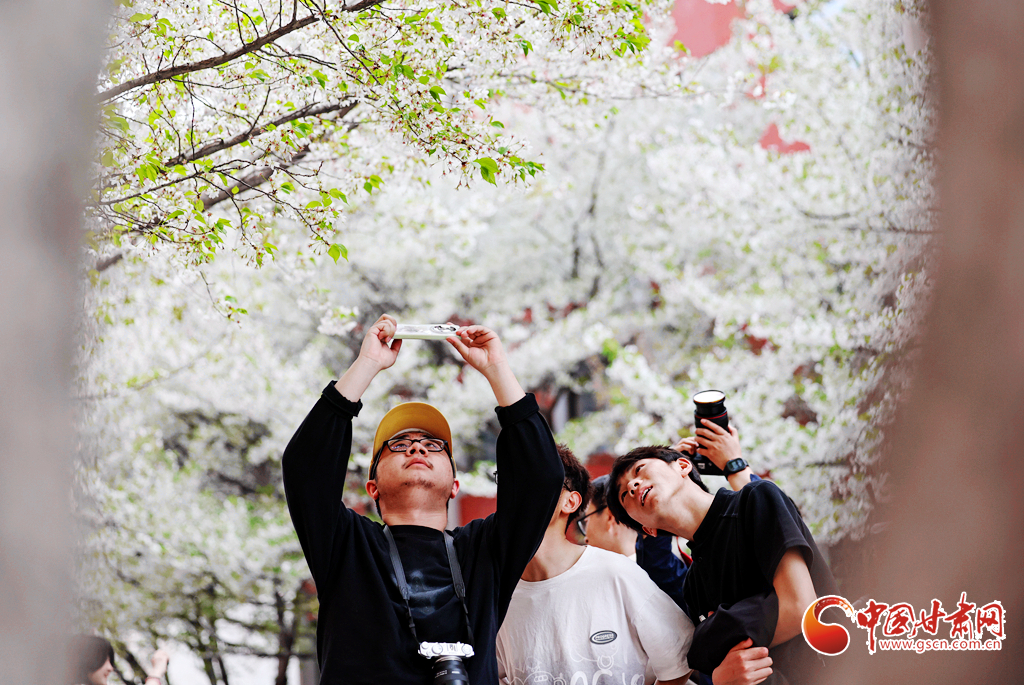 4月5日,學生們在蘭州大學校園內拍攝櫻花。