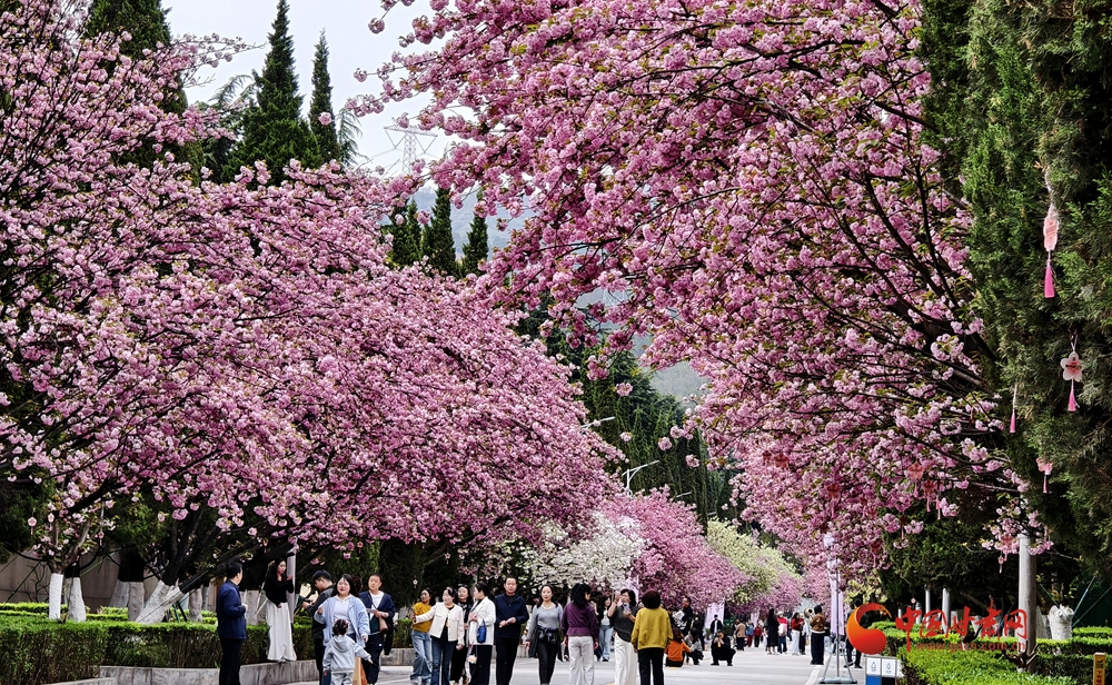 4月10日,在金徽酒文化生態(tài)旅游景區(qū),游客漫步櫻花大道,踏春賞花。