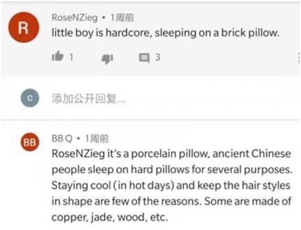 RoseNZieg留言:“這是個硬核男孩兒,睡在石頭枕頭上。”BBQ回復樓主:“這個枕頭是瓷器,中國古人都睡在這種硬枕頭上,還有一些是銅、玉、木頭做的。睡這種枕頭,不冬暖,但夏涼,還能保持飄逸的發(fā)型”