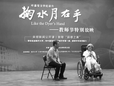 九月十日教師節(jié),南開大學(xué)舉辦《掬水月在手》影片首映式。葉嘉瑩先生是國(guó)際儒聯(lián)榮譽(yù)顧問(wèn),我銜命陪同王念寧副會(huì)長(zhǎng)專程赴南開致賀,有幸在南開禮堂聆聽九十六歲高齡的迦陵先生與白巖松共話詩(shī)意人生。迦陵先生坐在輪椅上娓娓道來(lái),鬢發(fā)皤然,聲如洪鐘,風(fēng)華絕代。