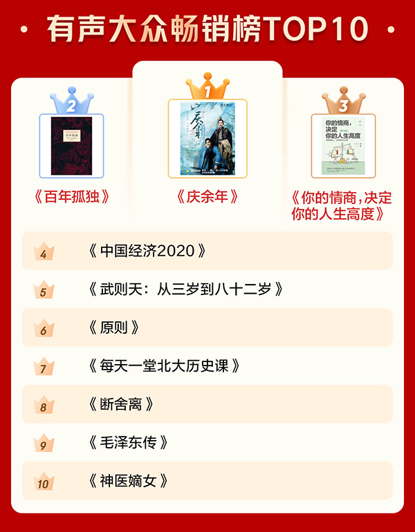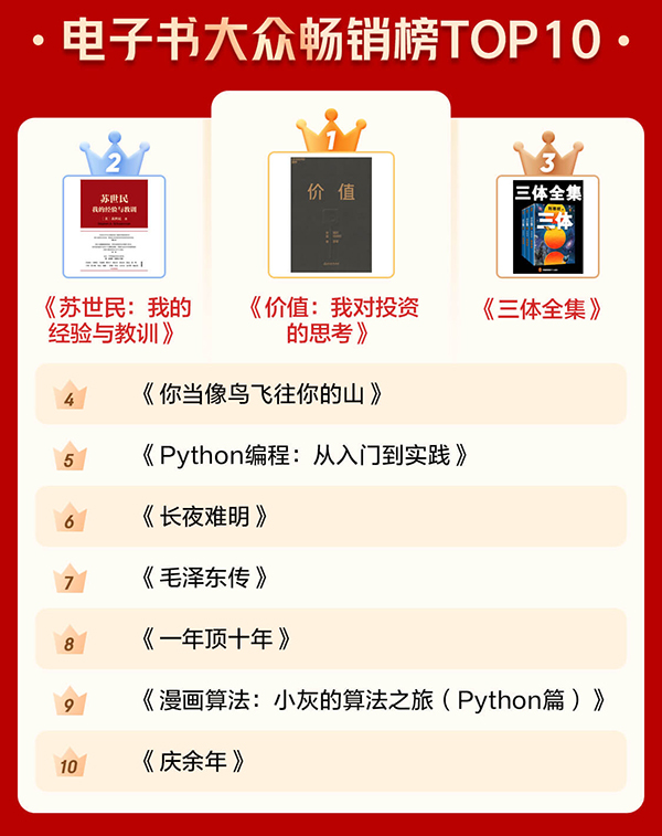 通過電子書暢銷榜TOP10和有聲暢銷榜TOP10可以看出,很多人愈發(fā)關(guān)注投資和管理等方面的內(nèi)容,也愈發(fā)注重個人學(xué)習(xí)?!秲r值:我對投資的思考》《蘇世民:我的經(jīng)驗與教訓(xùn)》 分別位居電子書暢銷榜第一名和第二名?!吨袊?jīng)濟2020》《原則》進入有聲暢銷榜前十。此外,學(xué)習(xí)類圖書《Python編程:從入門到實踐》《漫畫算法:小灰的算法之旅(Python篇)》也上榜電子書暢銷榜前十。