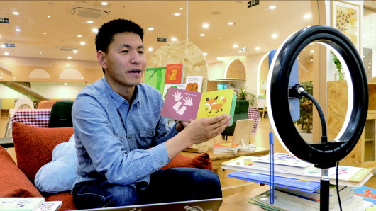 扎次通過(guò)直播講繪本故事(4月1日攝)。新華社記者旦增尼瑪曲珠攝