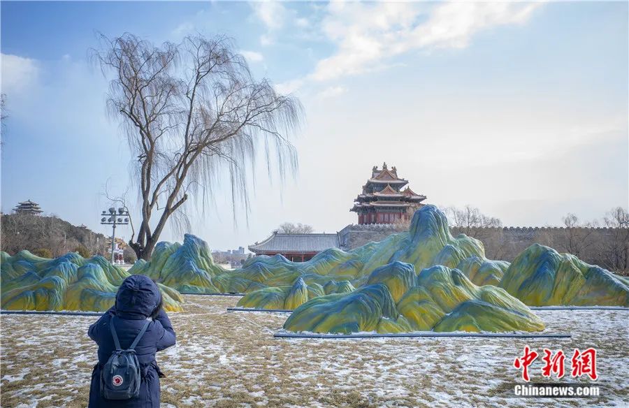 一位市民在北京故宮博物院西北角樓前欣賞“千里江山圖”布景。中新社記者 侯宇 攝