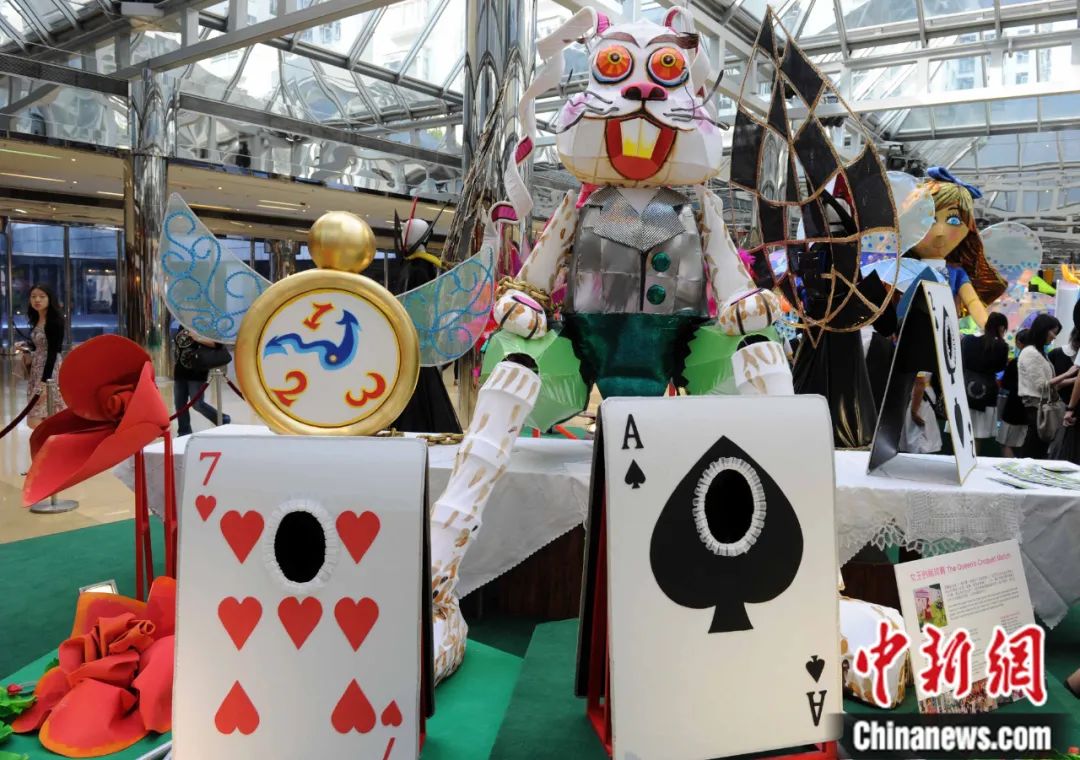 以西方著名兒童文學(xué)作品《愛麗絲夢游仙境》為藍(lán)本創(chuàng)作了巨型木偶及巡游藝術(shù)品在香港太古城中心亮相。中新社記者 任海霞 攝