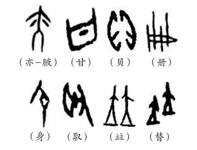 “象形者,畫成其物,隨體詰詘”(《說(shuō)文·敘》),是根據(jù)客觀物象的形態(tài)輪廓來(lái)構(gòu)成文字符號(hào)的方法。象形字又稱作“文”,“文者,物象之本”。如“貝”就是一個(gè)海貝的象形,也指貨幣;“冊(cè)”,就是由竹簡(jiǎn)編起來(lái)的簡(jiǎn)冊(cè)的象形;“身”為妊娠的形象,突出腹部。