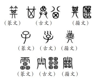 ?。ㄎ澹┧^“9353”,指的是《說(shuō)文》所收全部正篆,即《說(shuō)文》分析解釋的全部字?!墩f(shuō)文》收字以篆文為“正”,作為標(biāo)準(zhǔn)字體,這就是許慎所說(shuō)的“今敘篆文,合以古籀”的收字原則。“今敘篆文”,就是以篆文(小篆)作為標(biāo)準(zhǔn)正字,同時(shí)也會(huì)根據(jù)需要收列部分古文和籀文。《說(shuō)文》所謂“古文”主要是孔子壁中書和民間所獻(xiàn)古文經(jīng)所用的文字,“籀文”即傳為西周晚期太史籀所編字書《史籀篇》上的文字。從《說(shuō)文》來(lái)看,收入的古文、籀文,主要是與篆文有明顯差異的字形。如篆文“箕”“子”“雷”下所收列的古文、籀文: