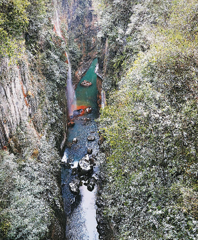 雪花飄飄,沿棧道往下走,山林被染成一幅黑白山水畫。風雨橋在地縫之上凌空飛舞,仿佛是通往地心的鑰匙。約75米深的云龍絕壁垂直下切,狹長,呈U型,崖壁皺紋黑灰,宛若剛出鞘的寶劍閃著寒光。底下是云龍河,水淺,清澈,叮叮咚咚,增添些許歡快,而讓地縫變得富有激情的是沐撫盆地流出的7條瀑布,其中最美的是五彩黃龍瀑布。瀑布從60米高的峭壁跌落下來,纖細,飄灑,婀娜。“銀花下散布水臺,混沌鑿破山根隈。”從暗河流出的水含黃鐵礦,把巖壁和卵石刷洗得斑斕,連河水也變得絢麗。