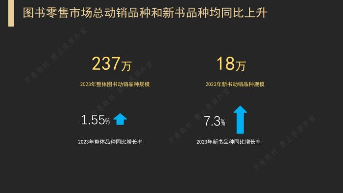 上述《報(bào)告》顯示,2023年整體零售市場總動銷品種達(dá)237萬種,同比上升1.55%,動銷新書品種達(dá)18萬種,同比上升7.3%。