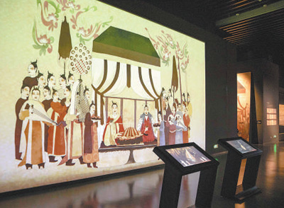 徐顯秀墓北壁壁畫(huà)《宴飲圖》互動(dòng)投影墻。人民網(wǎng)記者 王 帆攝
