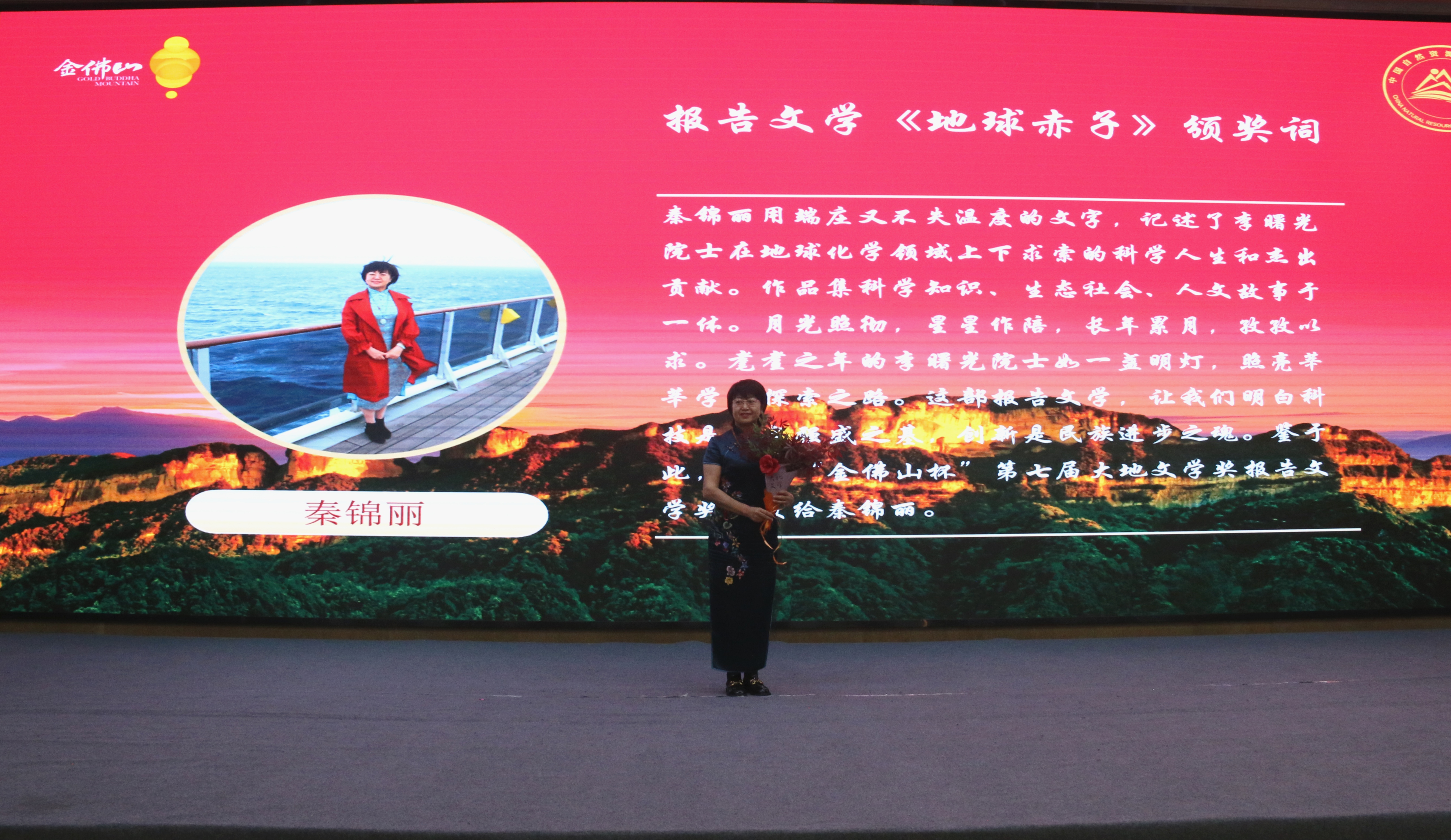 中國(guó)甘肅網(wǎng)4月28日訊 4月25日,“金佛山杯”第七屆大地文學(xué)獎(jiǎng)?lì)C獎(jiǎng)暨金佛山中國(guó)自然生態(tài)文學(xué)創(chuàng)作基地授牌儀式在重慶市南川區(qū)舉行。甘肅作家秦錦麗獲“金佛山杯”第七屆大地文學(xué)獎(jiǎng)報(bào)告文學(xué)獎(jiǎng)。
