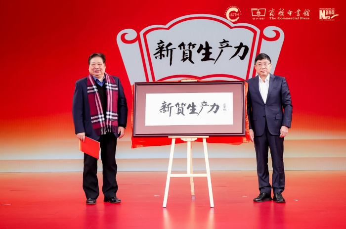 中國(guó)辭書(shū)學(xué)會(huì)會(huì)長(zhǎng)、北京語(yǔ)言大學(xué)教授李宇明(左),中國(guó)出版集團(tuán)有限公司副總經(jīng)理、黨組成員陳永剛(右)揭曉年度國(guó)內(nèi)詞“新質(zhì)生產(chǎn)力”。新華網(wǎng) 發(fā)