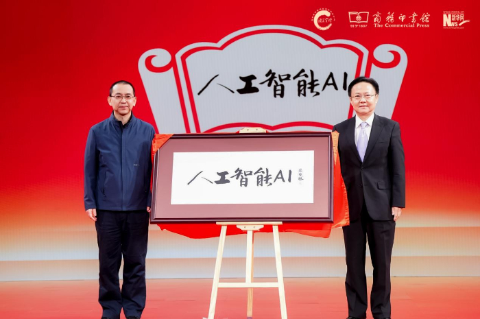 商務(wù)印書(shū)館副總經(jīng)理陳晗雨(左),中宣部“學(xué)習(xí)強(qiáng)國(guó)”學(xué)習(xí)平臺(tái)編委、副總經(jīng)理杜大力(右)揭曉年度國(guó)際詞“人工智能(AI)”。新華網(wǎng) 發(fā)