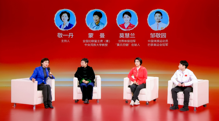 全國(guó)婦聯(lián)副主席(兼)、中央民族大學(xué)教授蒙曼,世界體操冠軍、“莫氏空翻”創(chuàng)始人莫慧蘭,中國(guó)體操運(yùn)動(dòng)員、巴黎奧運(yùn)會(huì)冠軍鄒敬園接受訪談。新華網(wǎng) 發(fā)