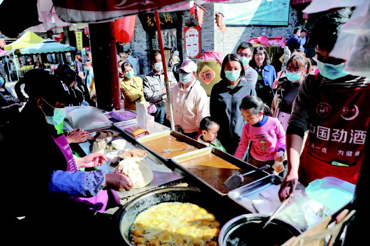 3月22日,在崆峒古鎮(zhèn)小吃一條街購(gòu)買小吃的游客排起了長(zhǎng)隊(duì)。記者 姚志強(qiáng) 攝