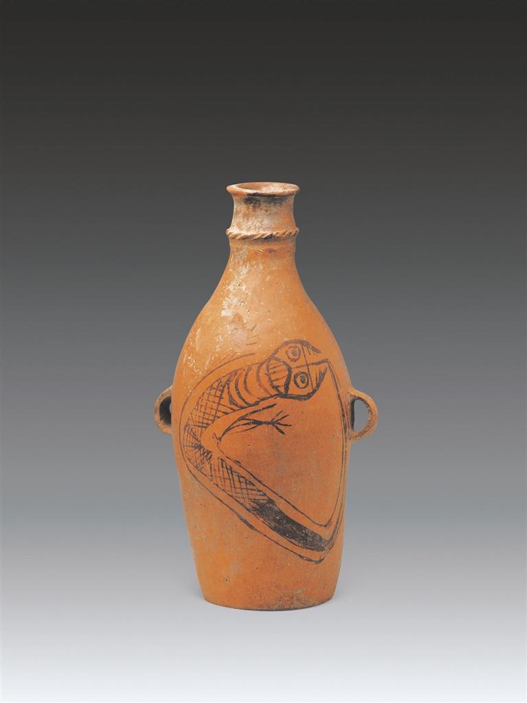 “鯢魚紋彩陶瓶”(距今約 5200 年),這是只工藝非常精美的彩陶瓶,式樣與后世的瓶一般無二了。更令人贊嘆的是勻稱凈美的瓶身上繪的一只娃娃魚,也就是學(xué)名鯢魚的彩繪! 這只娃娃魚雙目圓睜,大口露牙,長條曲折狀身軀,首尾相接,兩側(cè)飾爪形紋。彩陶瓶上的娃娃魚圖案繪得如此生動傳神,給這件精美的彩陶瓶平添了許多神秘意境和藝術(shù)魅力。