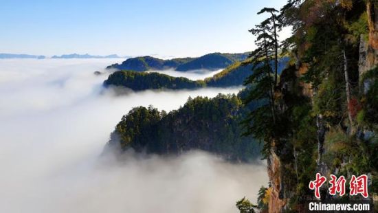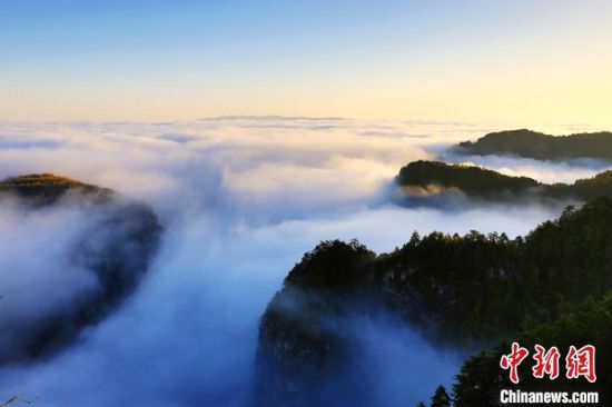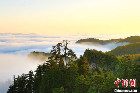 10月上旬,甘肅省定西市漳縣貴清山國家森林公園,朝陽在云層中若隱若現(xiàn),云遮霧繞的景象讓層巒疊嶂的山峰成為“云端村落”,仿若仙境。漳縣貴清山國家森林公園境內(nèi)原始森林遍布,森林、動植物資源十分豐富,貴清山被譽為隴中的“小華山”,是生態(tài)旅游勝地。
