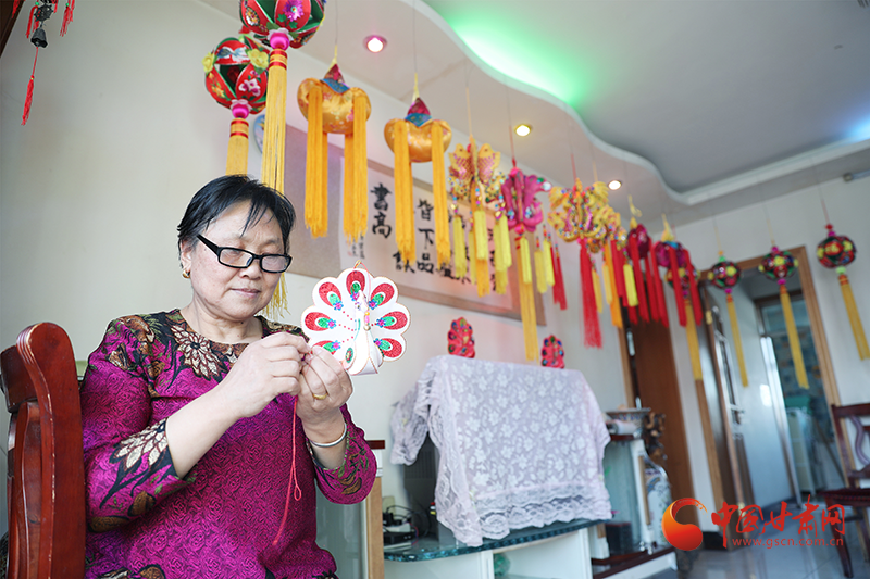 民樂(lè)縣宮燈制作代表王秀娥正在繡制孔雀手工藝品