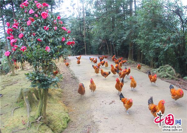 茶花具有“唯有山茶殊耐久,獨能深月占春風(fēng)”的傲梅風(fēng)骨,又有“花繁艷紅,深奪曉霞”的凌牡丹之鮮艷,因此自古以來就是極富盛名的木本花卉,在唐宋兩朝達到了登峰造極之境,直到十七世紀引入歐洲后,造成轟動,也因此獲得“世界名花”的美名。九龍街道牛街居委會小寨土雞生態(tài)產(chǎn)業(yè)園嬌艷的茶花給人一種神圣感,同時被賦予了一種原始的信仰:山茶是春天的神木,是春天的圣樹。置身九龍小寨土雞生態(tài)產(chǎn)業(yè)園,來一場與森林的浪漫邂逅,恍如仙境。園里有枇杷林、櫻桃林、楊梅林、梨樹林、紅豆杉林、柏樹林、椿樹林、油桃林、核桃林、灌木林以及草莓園、蔬菜園、山茶花園、荷花園,樹下是一群群羽毛鮮亮的土雞悠閑地覓食,好一幅田園風(fēng)景畫!