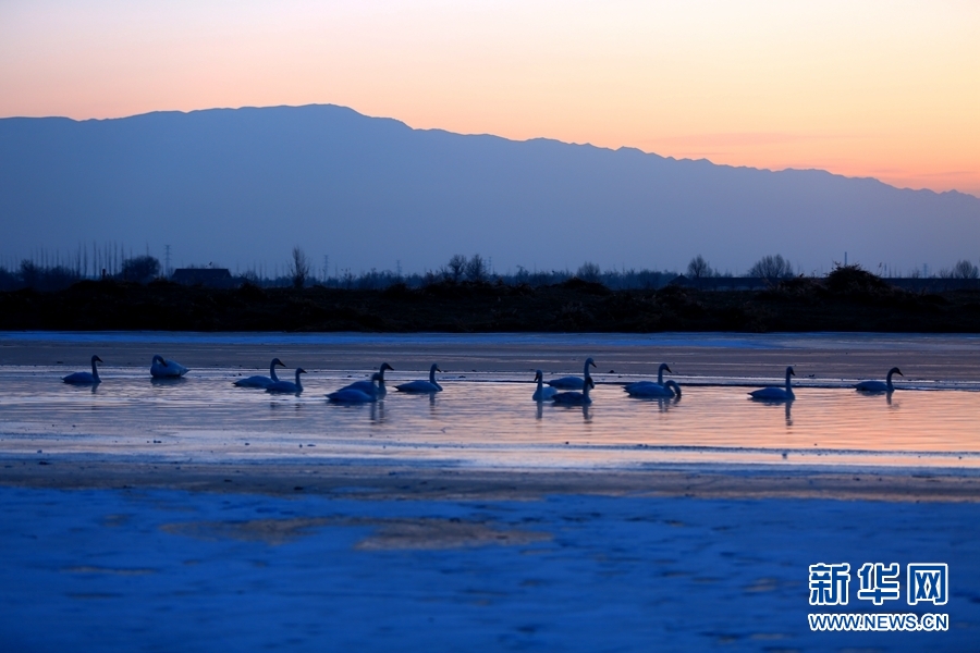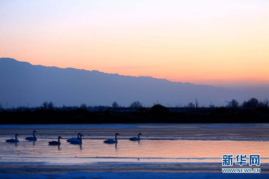 2022年1月2日,晨曦初露的甘肅省張掖市甘州區(qū)黑河流域,一群大天鵝在河中棲息、覓食,宛如一幅靜美的畫卷。新華網(wǎng)發(fā)(楊永偉 攝)