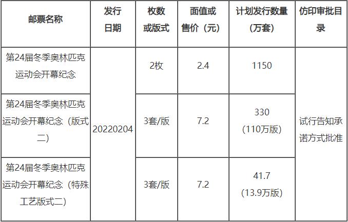 今日,國家郵政局公布《第24屆冬季奧林匹克運動會開幕紀念》紀念郵票計劃發(fā)行數(shù)量及仿印審批目錄情況。
