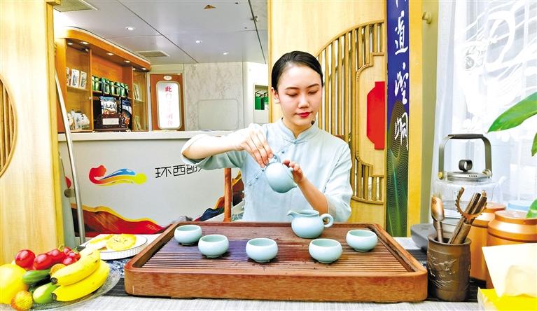 這趟列車由6節(jié)軟臥車廂、1節(jié)餐車、1節(jié)休閑娛樂功能車組成,車體內(nèi)外隨處可見平?jīng)鑫幕糜卧?。記者在車廂?nèi)看到,崇信龍泉寺、華亭安口窯古村落、靜寧仙人峽……每一間軟臥門上都是絕美的平?jīng)鲲L(fēng)光大片,整個(gè)車體儼然移動(dòng)的“平?jīng)鑫穆谜桂^”,讓人“身未動(dòng),心已遠(yuǎn)”。車體中部的功能車,更是顛覆了以往人們對(duì)火車的認(rèn)知,麻將桌、功夫茶、全套的K歌設(shè)備,還有平?jīng)鎏厣穆蒙唐贰⑥r(nóng)特產(chǎn)品展銷區(qū),平?jīng)鑫穆脮営[區(qū)、平?jīng)鑫幕黝}報(bào)刊欄,足以打發(fā)游客在旅途中的無聊時(shí)光。餐車也極富特色,車廂頂部裝飾有色彩豐富的藻井圖案,飛天仙子衣袂飄飄、環(huán)繞四周。“在這樣的餐車上吃飯,吃的那是品位。”一位乘客開心地和同行的伙伴說著。62歲的張女士一到平?jīng)鼍兔Σ坏亟o女兒發(fā)微信,“火車上住得舒適,服務(wù)好,環(huán)西部火車游·崆峒號(hào)很超值!”