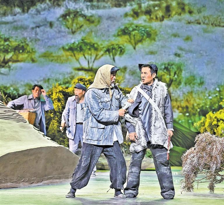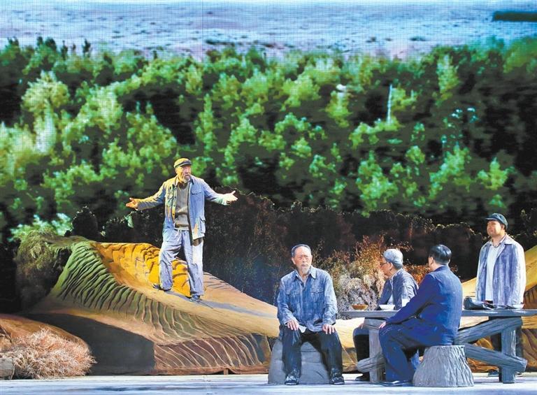 現(xiàn)實(shí)題材是話劇藝術(shù)的寵兒,在話劇進(jìn)入中國一百多年的時(shí)光中,現(xiàn)實(shí)題材創(chuàng)作占據(jù)相當(dāng)大的比例。在近當(dāng)代中國歷史的進(jìn)程中,話劇始終起著敢為天下先、針砭時(shí)弊的作用,但話劇又有其極其特殊的藝術(shù)框范。人們在觀看話劇時(shí),仿佛就是在觀看自己的人生,觀看自己和身邊最熟悉的人們,這是話劇藝術(shù)獨(dú)具的極高的審美要求。尤其是現(xiàn)代題材的創(chuàng)作,稍有不慎便會(huì)陷入同質(zhì)化的僵硬模式,使舞臺(tái)藝術(shù)失去應(yīng)有的美感。話劇《八步沙》讓6個(gè)老漢成為舞臺(tái)聚光燈下的主角,體現(xiàn)了創(chuàng)作者們呼應(yīng)時(shí)代之需,為最普通的農(nóng)民寫生立傳的拳拳之心。6個(gè)老農(nóng)民談不上人們通常意識中的“美”,“治沙”這樣的故事也相對比較單調(diào),不大容易出彩,而創(chuàng)作者們以八步沙這個(gè)真實(shí)的地名作為劇名,以“六老漢”治沙這個(gè)真實(shí)的事件作為全劇的敘述內(nèi)容,卻能宕開一筆把特定的外部環(huán)境與人物的內(nèi)心世界巧妙地融為一體,為全劇注入了濃郁飽滿的戲劇情境和情感,使這部話劇有了獨(dú)屬于自己的一份力度、一份無法替代的光彩。全劇的情節(jié)一曲三折,以小見大,當(dāng)黑壓壓的沙塵暴鋪天而來的時(shí)候,當(dāng)六老漢在嚴(yán)酷的環(huán)境中吃盡苦頭,摸索出“一棵樹,一把草,壓住沙子防風(fēng)掏”的寶貴經(jīng)驗(yàn),使漫無邊際的沙漠終于出現(xiàn)一抹綠色,繼而眼看著一棵又一棵綠樹成活成林,終于成為一片綠洲的時(shí)候,我相信觀眾的心也被藝術(shù)琴弦撥動(dòng),始終被劇情牽著走,為劇中人物的命運(yùn)擔(dān)心、懸心、痛心、開心,從中深深地感受到劇中所蘊(yùn)藏的豐富內(nèi)涵和它所傳達(dá)出的真切意趣。