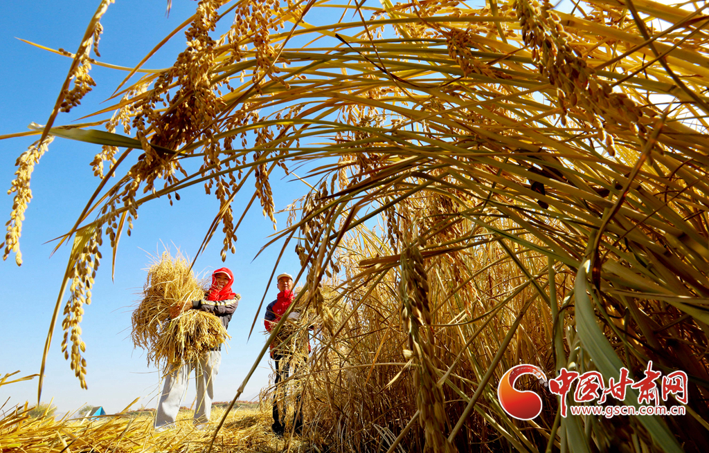 10月21日,位于祁連山下的甘肅省張掖市甘州區(qū)烏江鎮(zhèn)新河田園綜合體內(nèi),農(nóng)戶們正在收割成熟的高原水稻。
