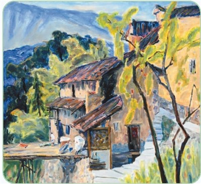李躍亮油畫作品《嶺頭民居》。