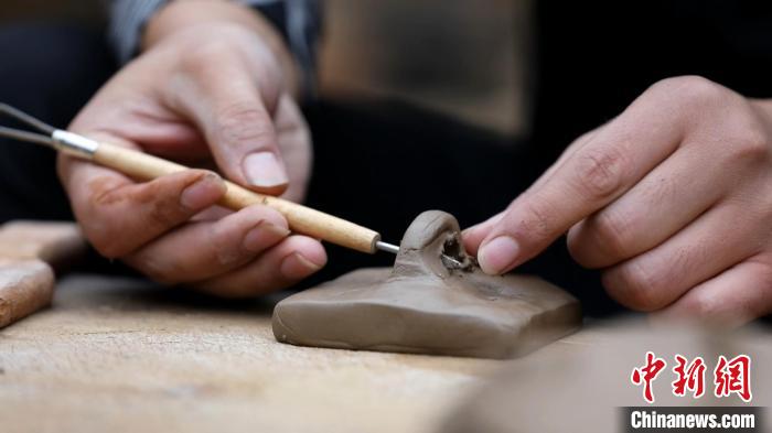 蔣繼濤說(shuō),柴燒陶印的制作過(guò)程,結(jié)合了書法繪畫、手工雕塑等技藝。“陶印的制作流程主要包括選土、配土、過(guò)濾、沉淀、制紐、晾曬、打磨、篆刻、入窯、燒制等程序,不僅要精通書法篆刻,還要熟悉雕法、燒窯等。”蔣繼濤一邊介紹,一邊手持刻刀。鋒利的刀尖在陶印上不斷游走,吹去浮塵,一枚古樸的柴燒陶印制作完成。